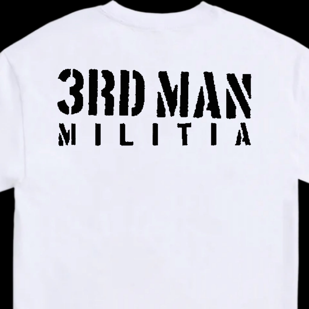 The original white on black design was one of our first and best selling tees, so we decided to bring it back with a new look. Show your 3rd Man pride with this Gary and Dino Show 3RD MAN MILITIA T-Shirt featuring a two-sided original design. Available in white shortsleeved ONLY. 100% cotton.